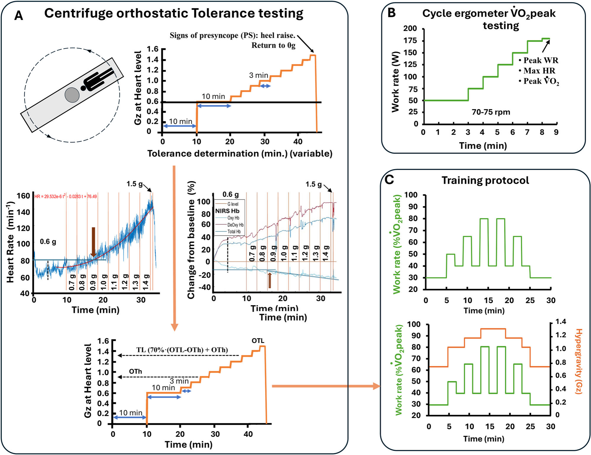 图C右下角:为每位受试者按随机顺序执行个体化测试方案(仅测力计测试及测力计联合AG测试),其中测力计联合AG方案的工作强度和AG水平匹配:30% VO₂峰值/OTh - 0.15Gz、50% VO₂峰值/OTh、65% VO₂峰值/(OTh+TL)/2以及80%