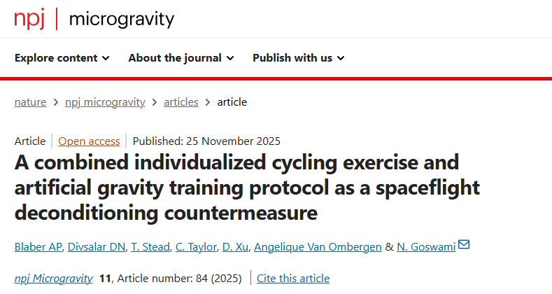 2025年11月25日,N. Goswami团队在期刊《npj Microgravity》 上发表了文章“A combined individualized cycling exercise and artificial gravity training protocol as a spaceflight deconditioning countermeasure"。该研究聚焦于探索一种结合个性化自行车运动与人工重力训练的方案,作为对抗航天飞行后立位耐力下降的防护措施。